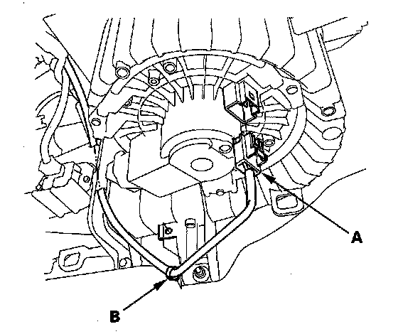 8. Disconnect the connector (A) from the blower motor. Remove the wire harness clip (B).
