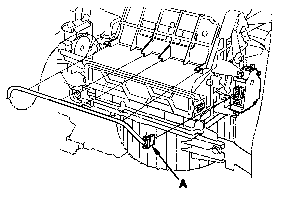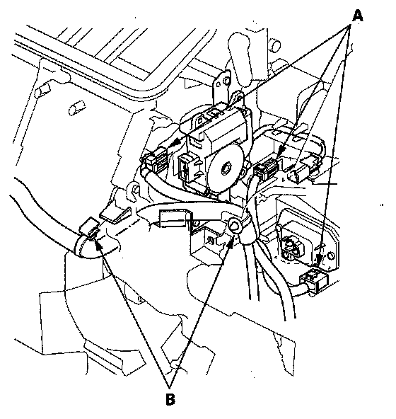 10. Disconnect the connectors (A) from the mode control motor, the evaporator temperature sensor, and the power transistor. Remove the wire harness clips (B).