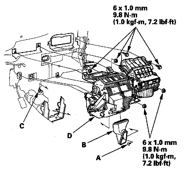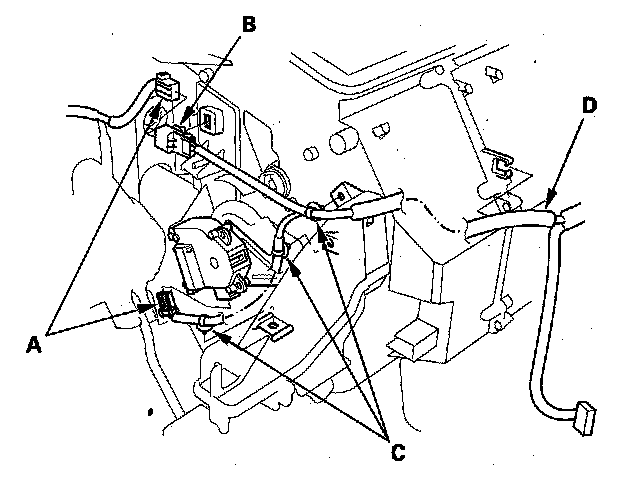 11. Disconnect the connectors (A) from the air mix control motor and A/C wire harness. Remove the connector clip (B), the wire harness clips (C), and the wire harness (D).