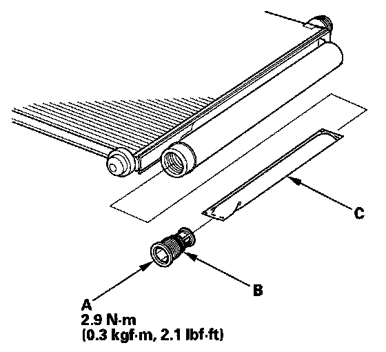2. Remove the cap (A) from the bottom of the A/C condenser. Remove the O-ring (B) and the desiccant (C).