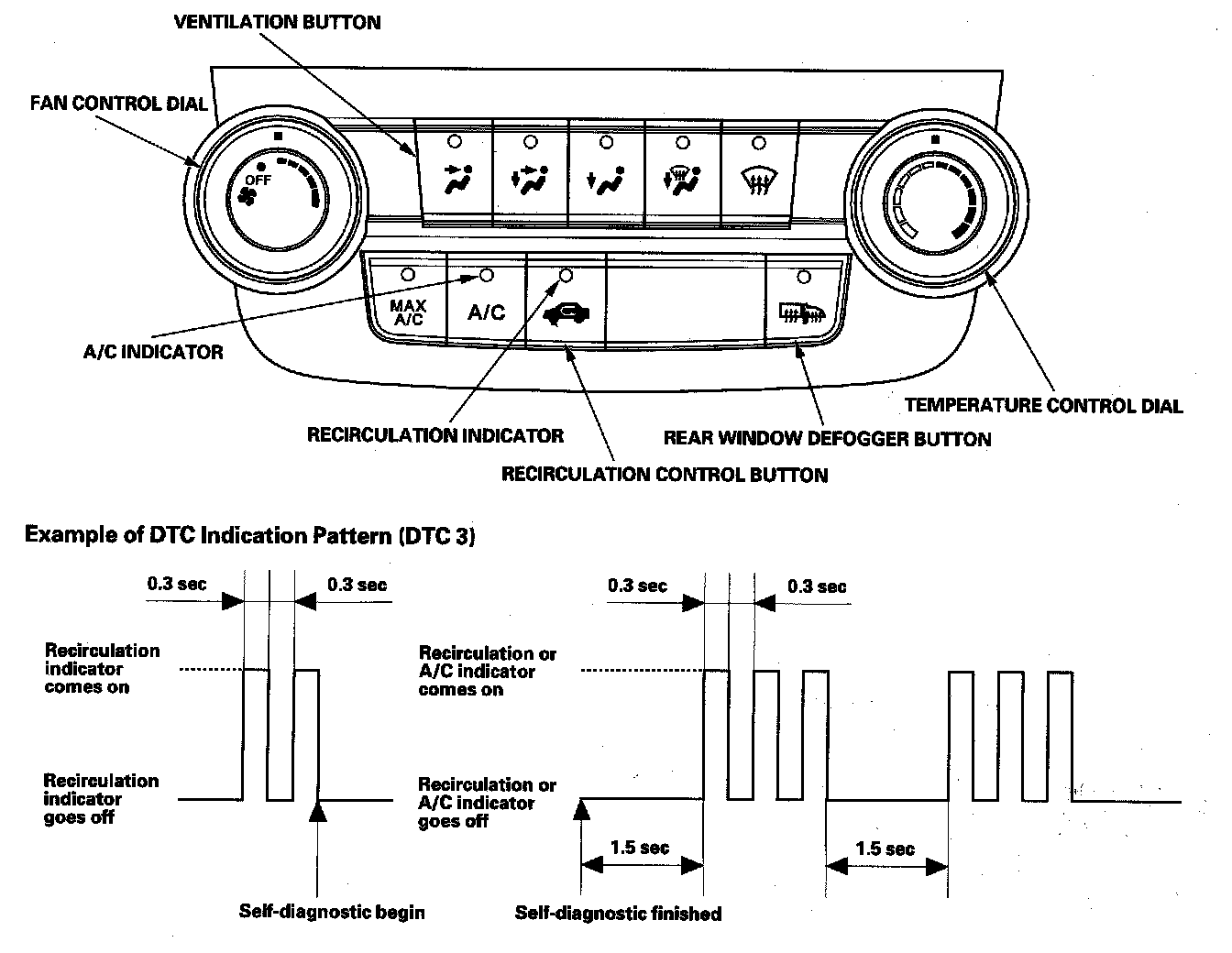 4. Press and hold the RECIRCULATION CONTROL button, then press the REAR WINDOW DEFOGGER button five times within 10 seconds. Release the RECIRCULATION CONTROL and REAR WINDOW DEFOGGER buttons; the recirculation indicator blinks two times, then the self-diagnostic begins.