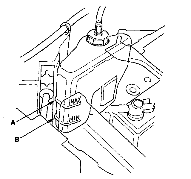 1. Look at the coolant level in the coolant reservoir. Make sure it is between the MAX mark (A) and MIN mark (B).
