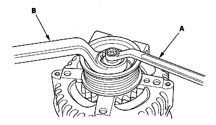 3. If the front bearing needs replacing, remove the pulley locknut with a 10 mm wrench (A) and a 22 mm wrench (B). If necessary, use an impact wrench.