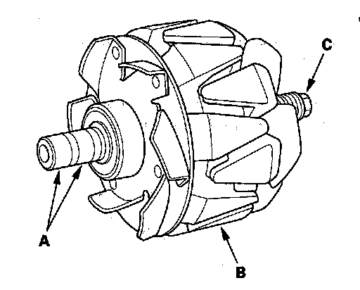 15. Check for continuity between each slip ring and the rotor (B) and the rotor shaft (C).