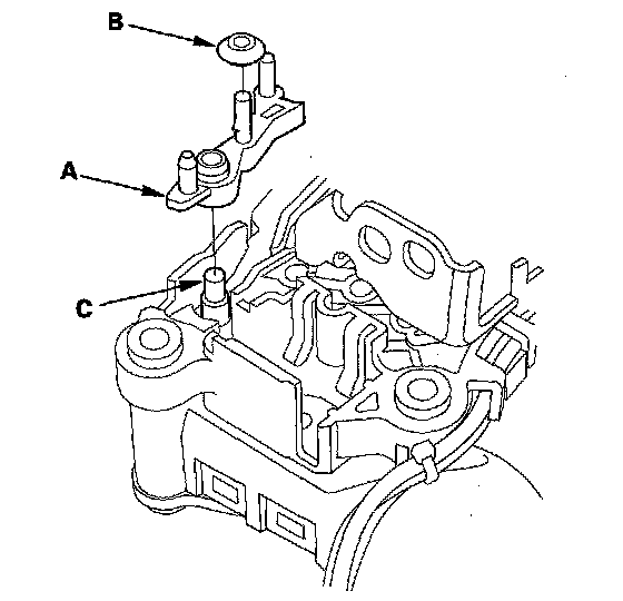 4. Apply silicone grease to the pin (C) on the shift lever bracket base, and install the shift lock stop over the pin.