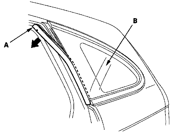 2. Remove the front seal (A) from the front edge of the quarter glass (B). If necessary, cut the seal with a utility knife.