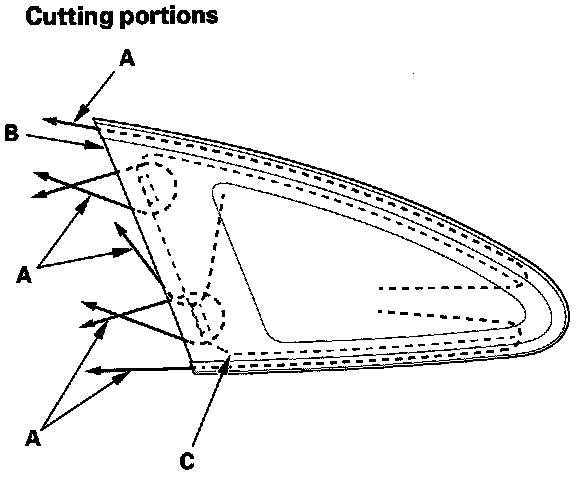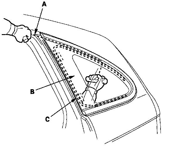 7. From inside the vehicle, use a knife (A) to cut rear clip'(B) of the quarter glass molding, then cut through the adhesive (C) of quarter glass rear corner.