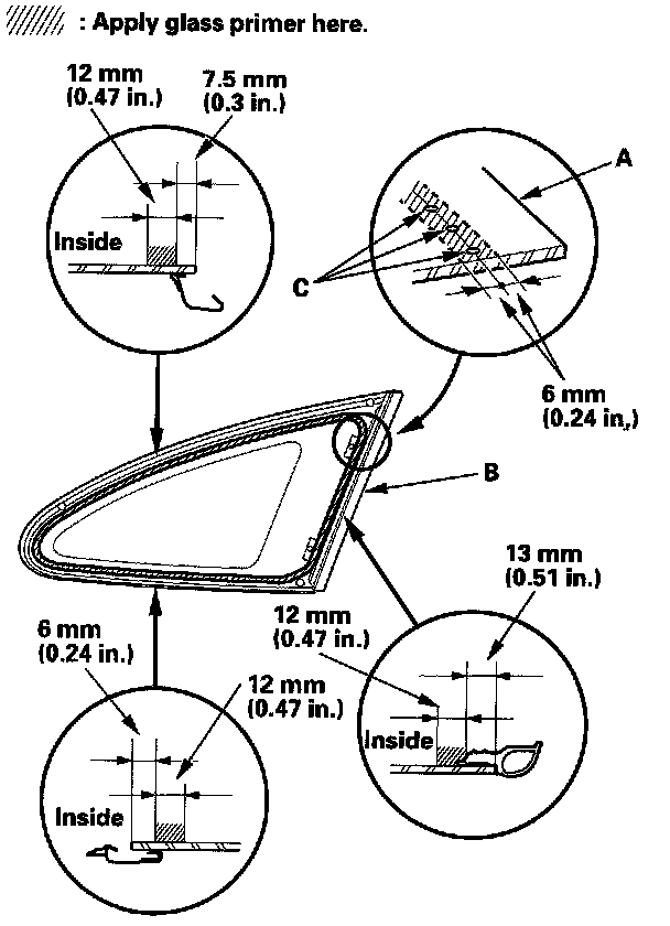 - With the printed dots (C) on the quarter glass as a guide, apply the glass primer to the rear corner, upper corner and lower corner portions of the quarter glass.