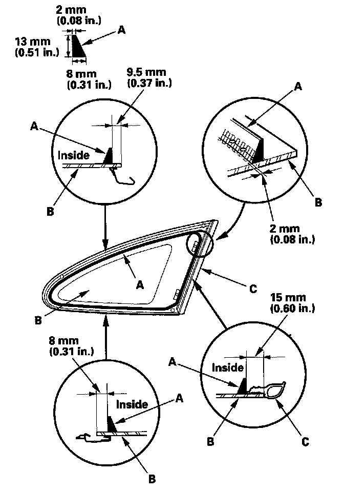13. Set the quarter glass (A) in the opening, and make alignment marks (B) across the quarter glass and body with a grease pencil at the three points shown. Make sure both clips (C) contact with the edge of the body holes. Be careful not to touch the glass where adhesive will be applied.