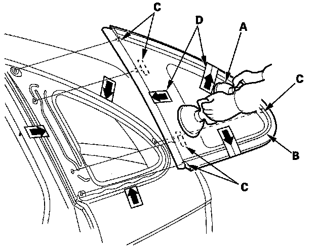 12. Attach the front seal (A), lower clip (B), and upper clip (C) with adhesive tapes to the inside face of the quarter glass (D) as shown. Before installing the front seal, apply primer to the inside face of the quarter glass.