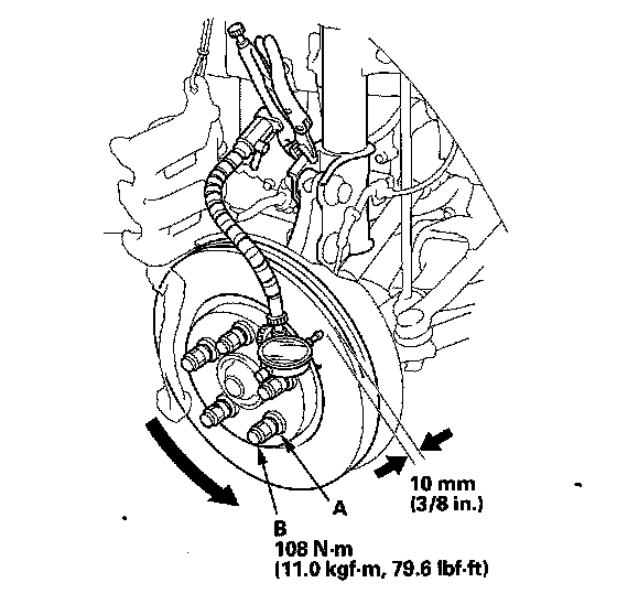 5. Install suitable flat washers (A) and wheel nuts (B), and tighten the wheel nuts to the specified torque to hold the brake disc securely against the hub.