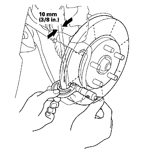 6. Set up the dial gauge against the brake disc as shown, and measure the runout at 10 mm (3/8 in.) from the outer edge of the brake disc.