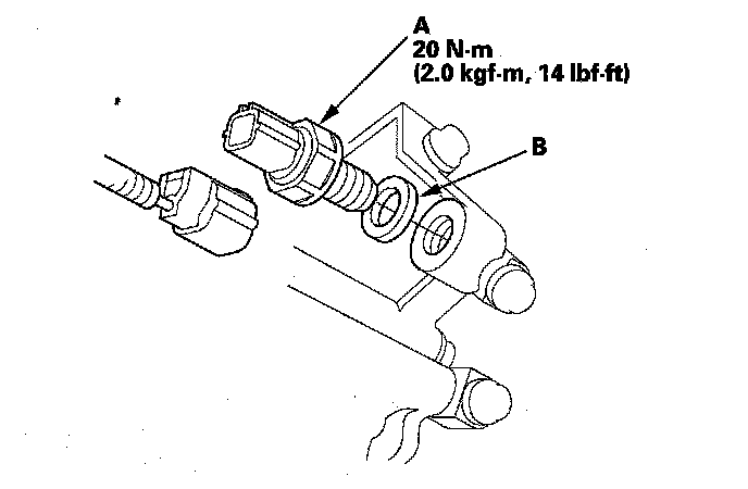 4. Install the new 3rd clutch transmission fluid pressure switch (A) and a new sealing washer (B), and tighten the switch.