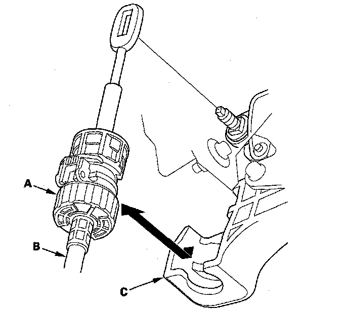 7. Lower the socket holder (A), then slide it to remove the shift cable (B) from the shift cable bracket (C).