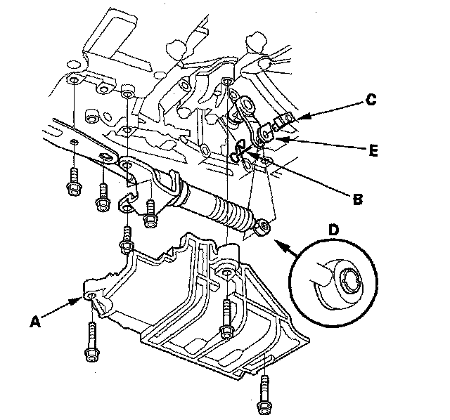 9. Remove the spring clip (B) and control pin (C), and separate the shift cable end (D) from the control lever (E). Remove the bolts securing the shift cable brackets.