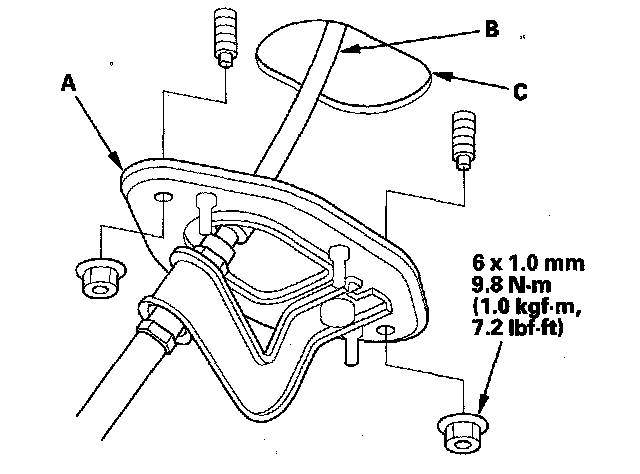 12. Insert the new shift cable through the grommet hole (C), and install the grommet in its hole. Do not bend the shift cable excessively.
