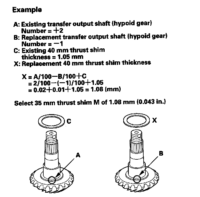 1. Select the 35 mm thrust shim if the transfer output shaft is replaced. Calculate the thickness of the 35 mm thrust shim using the formula, and select the shim from the table.