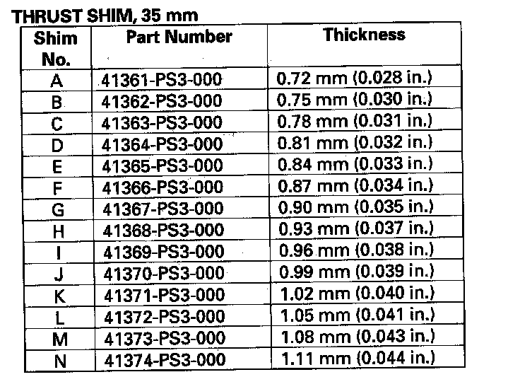 2. Select the 35 mm thrust shim if the tapered roller bearing on the transfer output shaft is replaced. Measure the thickness of the replacement bearing and the existing bearing, and calculate the difference of the bearing thickness. Adjust the thickness of the existing 35 mm thrust shim by the amount of the difference in bearing thickness, and select the replacement 35 mm thrust shim from the table.