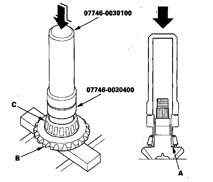 3. Install the 35 mm thrust shim (A) on the transfer output shaft (B), then install the tapered roller bearing (C) using the driver (40 mm I.D.), the attachment (35 mm I.D.), and a press.