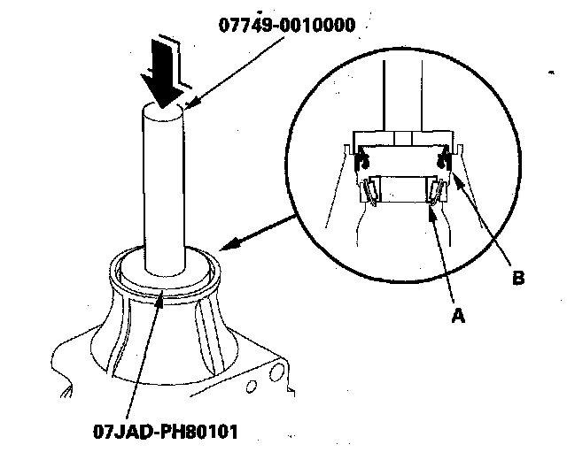 47. Install the new 75 mm thrust shim (A) in the transfer holder, then install the tapered roller bearing outer race (B) using the driver and the attachment (72 x 75 mm).