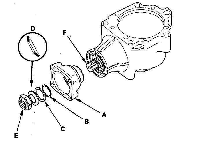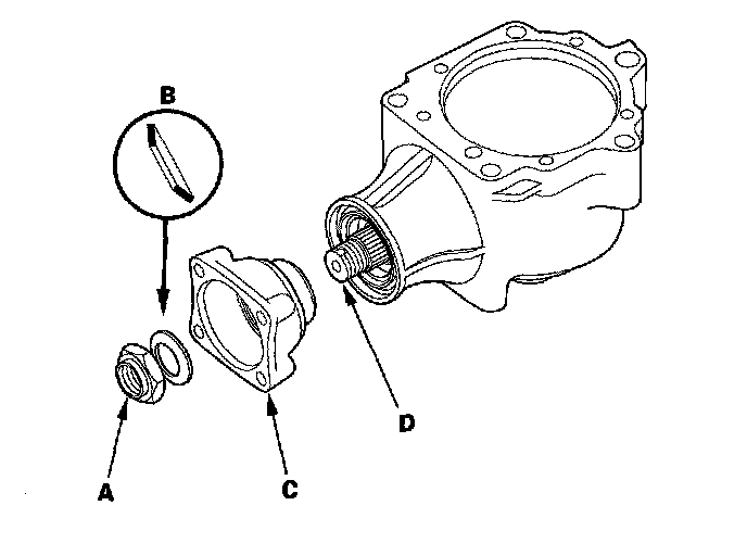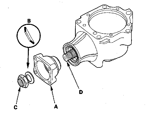 7. Install the companion flange (A), conical spring washer (B), and locknut (C) on the transfer output shaft (D). Do not install the O-ring and back-up ring.
