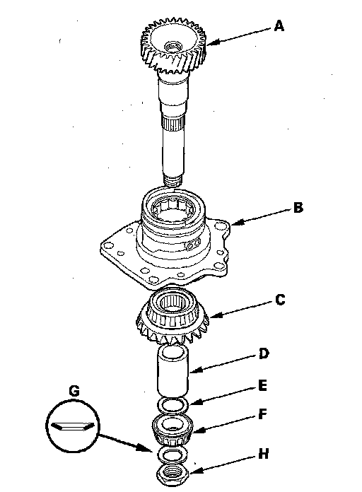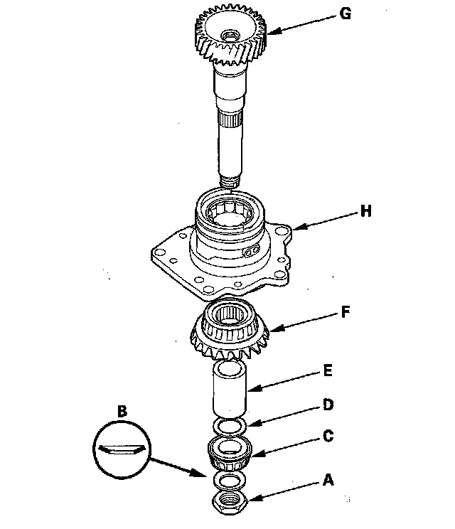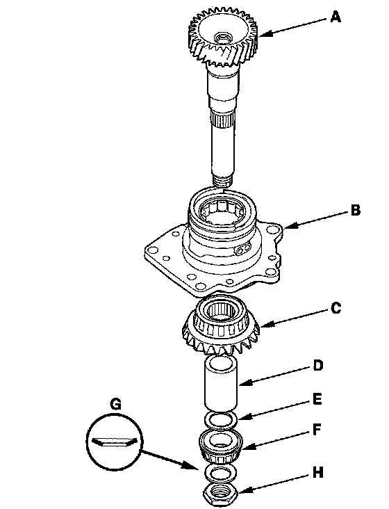 11. Install the transfer shaft (A) in the transfer holder (B), and install the transfer drive gear (C), transfer collar (D), 25 mm thrust shim (E), tapered roller bearing (F), conical spring washer (G), and locknut (H).