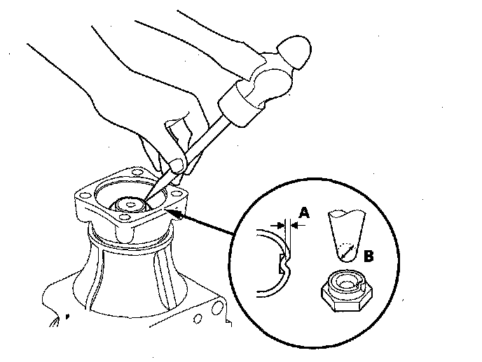 53. Stake the locknut into the transfer shaft in depth (A) of 0.7-1.2 mm (0.03-0.05 in.) using a 3.5 mm punch (B).