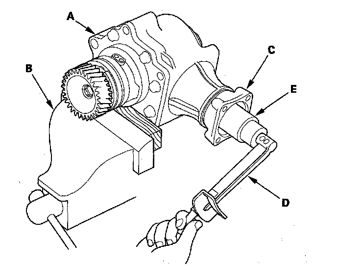 38. Measure the starting torque at the companion flange (C) using a torque wrench (D) and a socket (E).