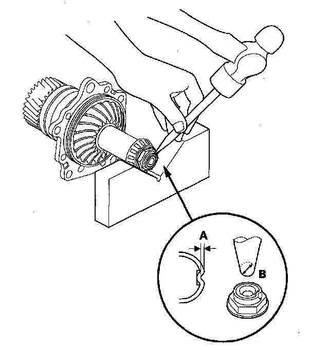 34. Stake the locknut into the transfer output shaft in depth (A) of 0.7-1.2 mm (0.03-0.05 in.) using a 3.5 mm punch (B).