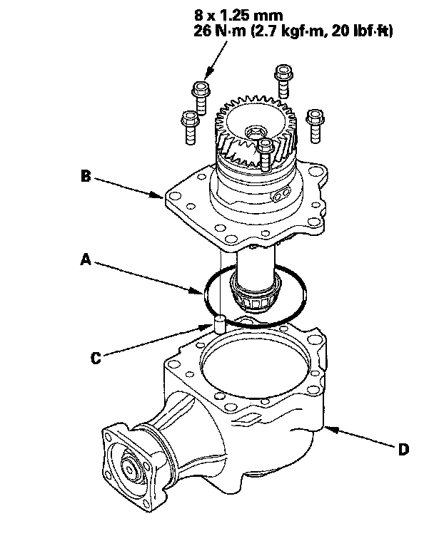 54. Install the new O-ring (A) on the transfer holder (B), then install the transfer holder with the dowel pin (C) on the transfer housing (D).