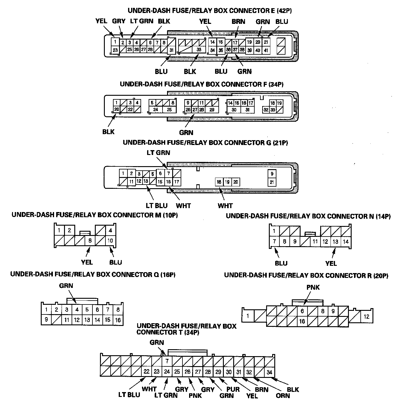 3. Disconnect the under-dash fuse/relay box connectors E, F, G, M, N, Q, R, and T.