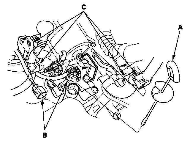 12. Disconnect the A/C compressor clutch connector (A). Remove the bolt and the nut, then disconnect the suction hose (B) and discharge hose (C) from the A/C compressor. Plug or cap the lines immediately after disconnecting them to avoid moisture and dust contamination.