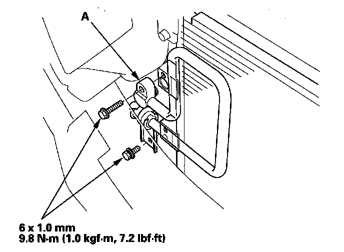 7. Remove the A/C condenser (A). Be careful not to damage the radiator and A/C condenser fins when removing the A/C condenser.