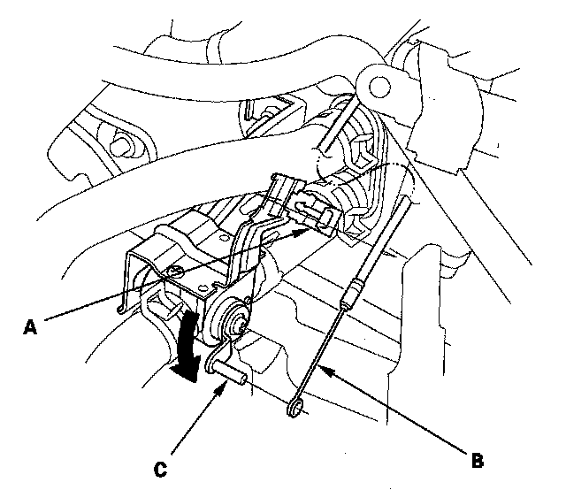 5. From under the hood, open the cable clamp (A), then disconnect the heater valve cable (B) from the heater valve arm (C). Turn the heater valve arm to the fully opened position as shown.