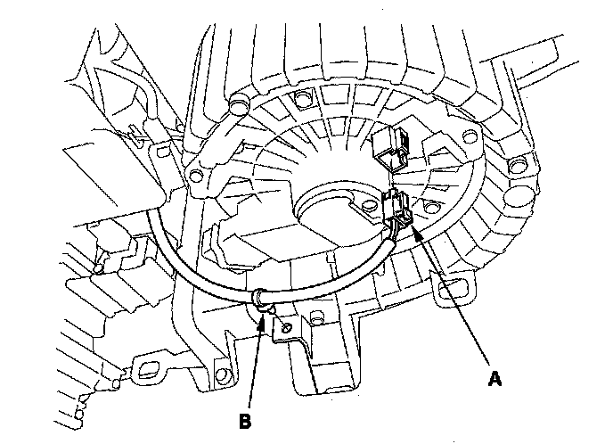 10. Disconnect the connector (A) from the blower motor. Remove the wire harness clip (B).