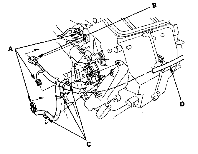 13. Disconnect the connectors (A) from the air mix control motor, heater core temperature sensor, and A/C wire harness. Remove the connector clip (B), the wire harness clips (C), and the wire harness (D).