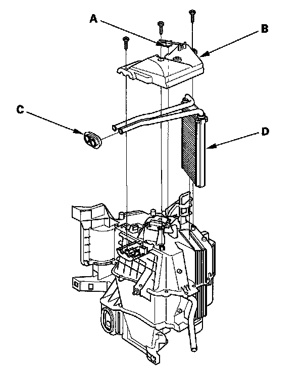 15. Remove the connector clip (A), the self-tapping screws, the heater core cover (B), the grommet (C), and carefully pull out the heater core (D).
