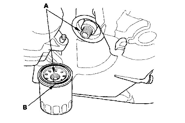 4. Inspect the threads (A) and the rubber seal (B) on the new filter. Wipe off the seat on the oil pan, then apply a light coat of new engine oil to the filter rubber seal. Use only filters with a built-in bypass system.