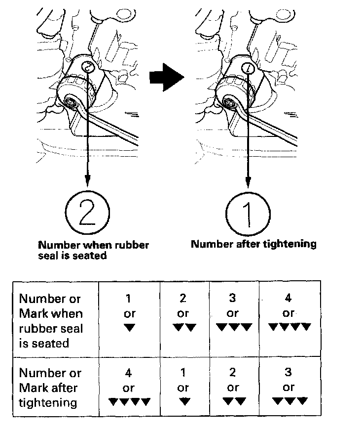 ^ Spin the filter on until its seal lightly seats against the oil pan, and note which number or mark is at the bottom.
