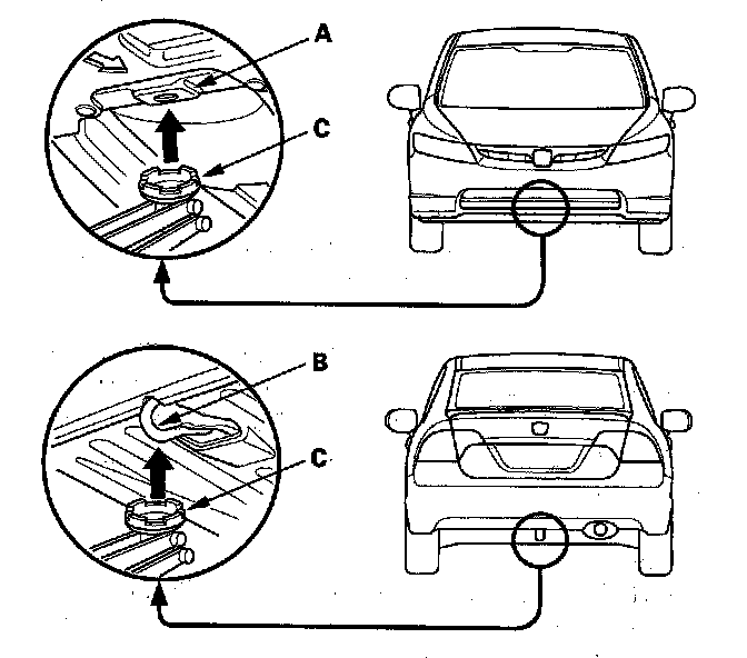 3. Position the floor jack under the front jacking bracket (A) or the rear jacking bracket (B). Center the jacking bracket on the jack lift platform (C), and jack up the vehicle high enough to fit the safety stands under it.
