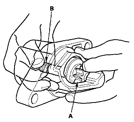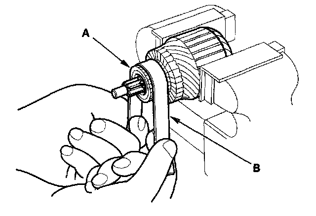 14. Holding the drive gear (A), turn the gear shaft (B) clockwise. Check that the drive gear comes out to the other end. If the drive gear does not move smoothly, replace the gear cover assembly.