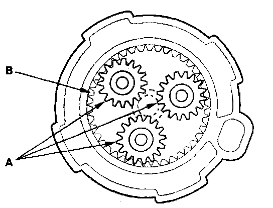 13. Check the planetary gears (A) and ring gear (B). Replace them if they are worn or damaged.