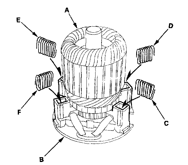 18. Squeezing a spring (C), insert it in the hole on the brush holder, and push it until it bottoms. Repeat this for the other three springs (D, E, and F).