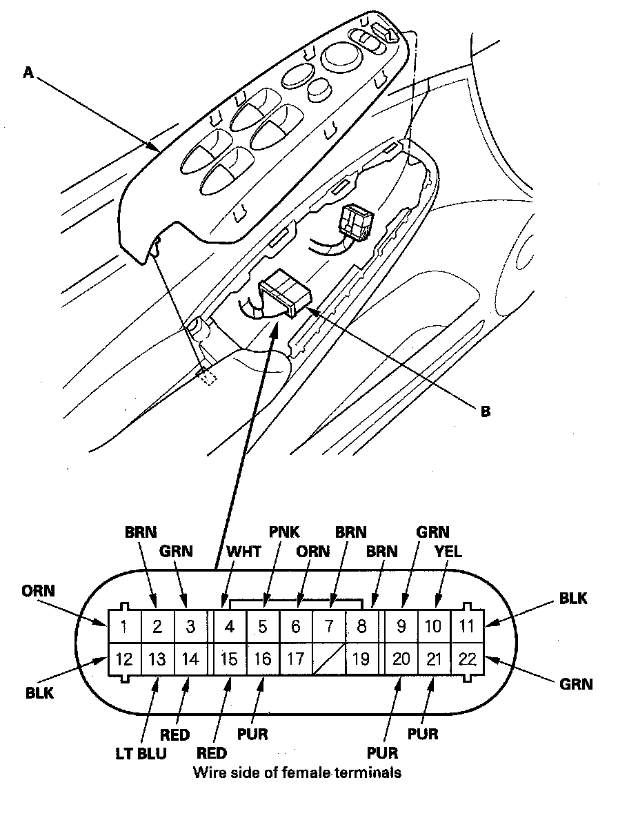 5. Reconnect the 22P connector to the power window master switch. Turn the ignition switch ON (II), and make these input tests at the connector.