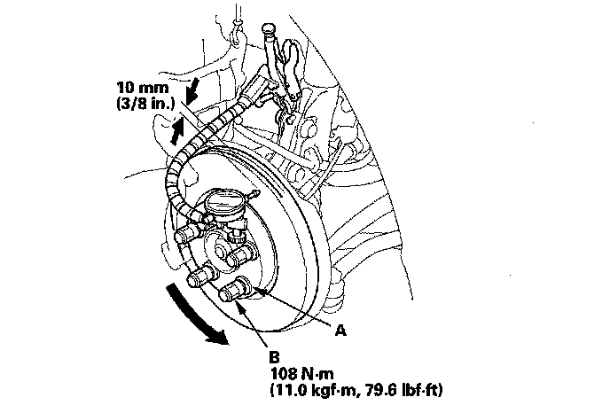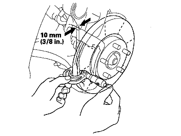 6. Set up the dial gauge against the brake disc as shown, and measure the runout at 10 mm (3/8 in.) from the outer edge of the brake disc.