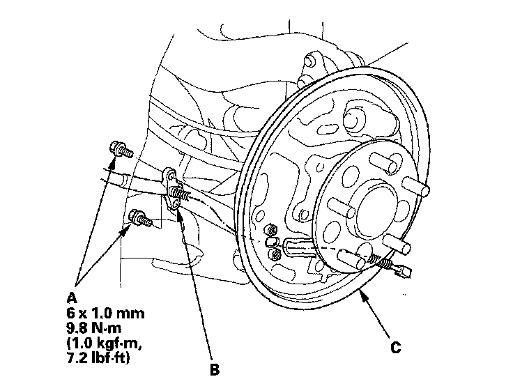 3. Remove the flange bolts (A) and the parking brake cable (B) from the backing plate (C).