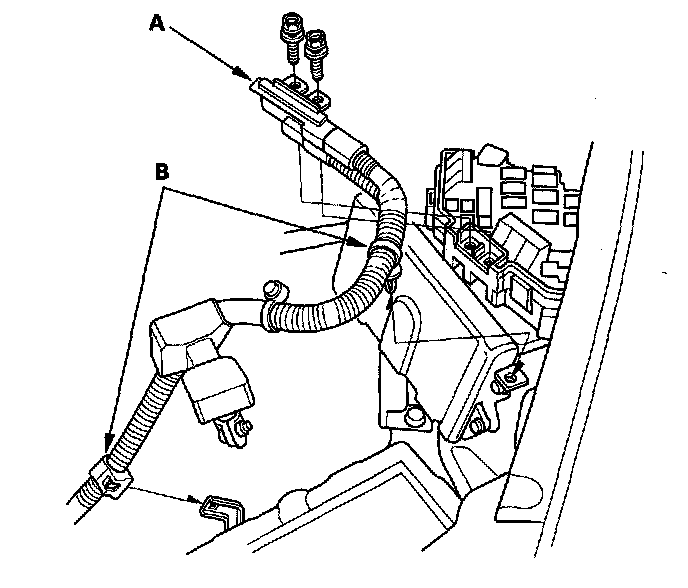 11. Remove the battery cables (A) from the under-hood fuse/relay box.