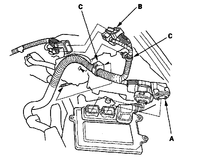14. Disconnect the PCM connectors (A) and the engine wire harness connectors (B).