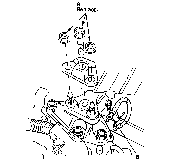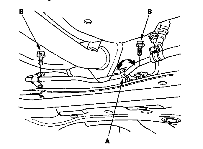 30. Unclamp the power steering fluid line clamp (A) on the front subframe, and remove the P/S line mounting bolts (B).
