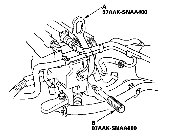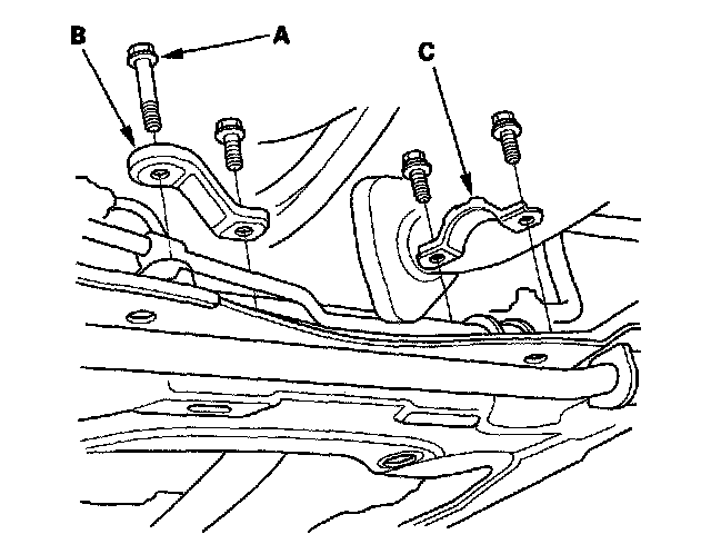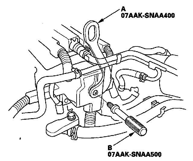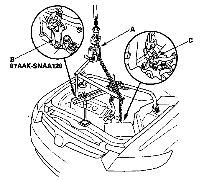 52. Attach a chain hoist (A) to the engine hanger plate (B) and transmission hook (C). Lift up on the engine/transmission assembly until it's securely supported by the chain hoist, and remove the engine support hanger from the engine and vehicle.